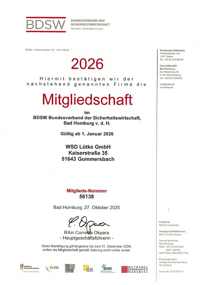 Sicherheit braucht Standards – und Standards brauchen Nachweise. Bei WSD Lütke legen wir großen Wert darauf, unsere Qualität und Zuverlässigkeit nicht nur zu behaupten, sondern durch offizielle Zertifikate und Auszeichnungen belegen zu können. Sie sind ein sichtbares Zeichen für unser Engagement, stets nach den höchsten Maßstäben zu arbeiten.